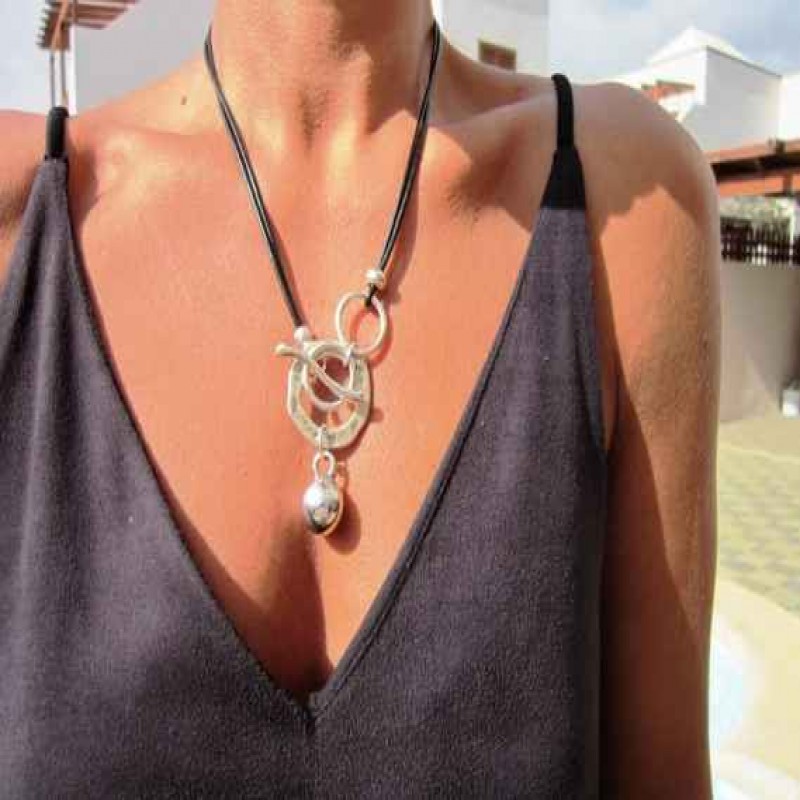 Bu kolye hakiki deri ve gümüş kaplama boncuklardan yapılmıştır. Tüm gümüş parçalar 8 mikron saf gümüş kaplama ile antialerjik (nikel ve kurşunsuz) işleme tabi tutulmaktadır.