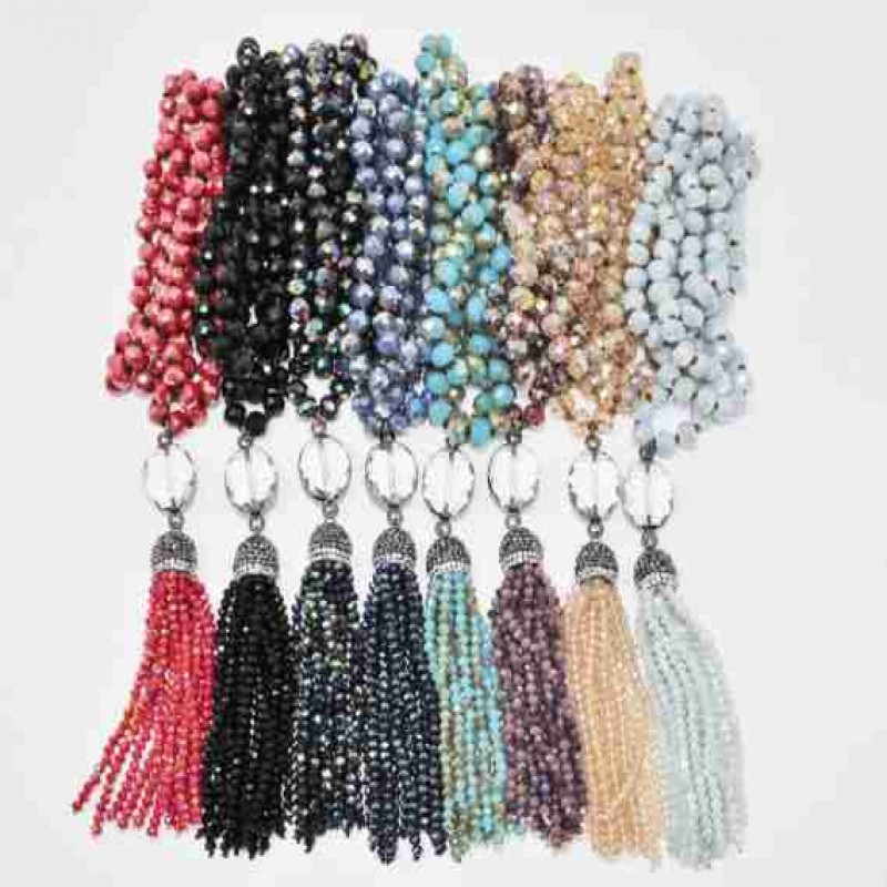 8x6mm Düğümlü Kristal Tunç Kristal Merkez Parçasına Sarılmış ve Püskül Kolye Kolyeler (36 İnç)