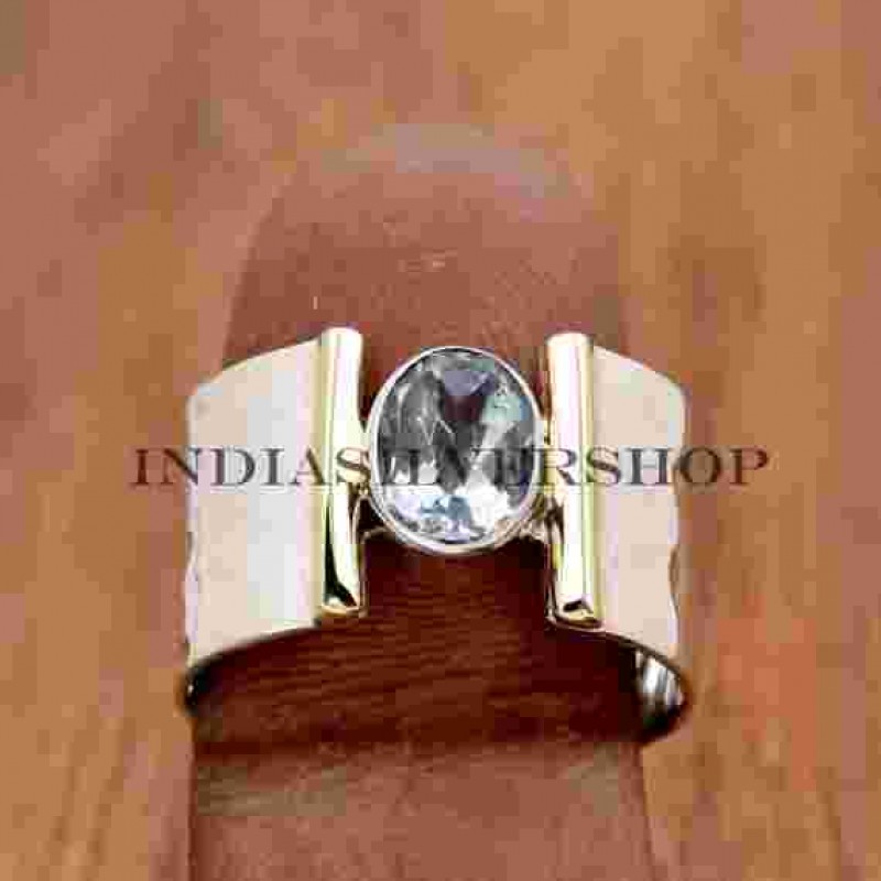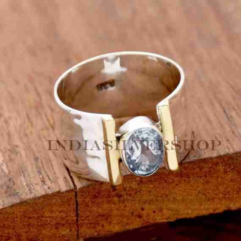 Doğal Mavi Topaz Taşlı Yüzük, 925 Ayar Gümüş El Yapımı Yüzük, İki Tonlu Yüzük, Dövme Yüzük, D