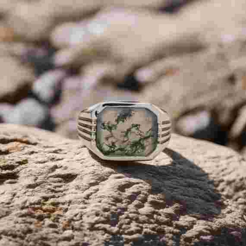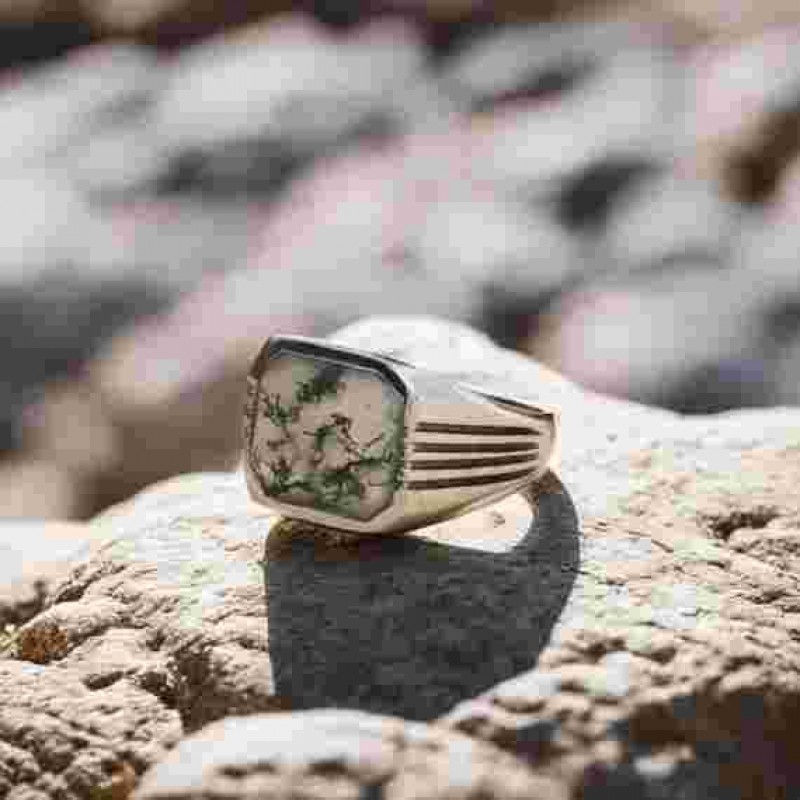 Doğal Yosun Akik Yüzük, 925 Ayar Gümüş Yüzük, Yosun Akik Erkek Yüzük, Söz Yüzüğü, Kendisine Hediye