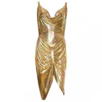 Altın kaplamalı Whiting ve Davis metal ağdan yapılmıştır. Bu gösteriyi durduran bir parça. Emily Ratajakowski bunun bir versiyonunu Paris'te giydi ve Vogue tarafından en iyi giyinen seçildi. Elbisenin ayrıca satın alabileceğimiz bir kapüşonu var. Boyut 0-4. Atölyemiz, vintage tarzın cazibesini çağdaş bir uyumla size sunan ideal ve güçlü bir parça yarattı. Parçanın uzun ömürlü olmasını sağlamak için tüm ağır stresli alanlar dahili el dikişleriyle yeniden güçlendirilmiştir. Başlık 21,5 inç uzunluğundadır. Bu elbisenin arkası açık olduğundan göğüs ölçüsü farklılık gösterebilir. Sipariş üzerine 10 hafta teslimat süresi ile üretilir.