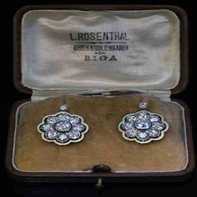 Küpeler dönemin kahverengi deri perakendecisinin çantasında geliyor. Kasa 'L. ROSENTHAL Uhren & Boldwaaren RIGA' damgasını taşıyor.