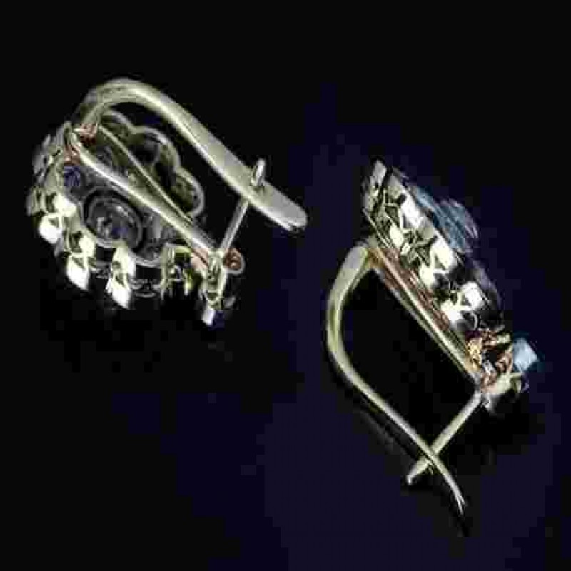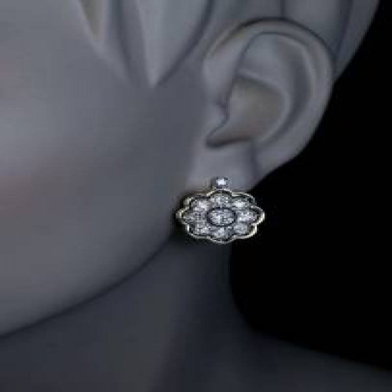 Bu özenle hazırlanmış 18K yeşilimsi sarı altın ve platin küme küpeler, uyumlu, parlak beyaz eski maden kesim ve eski Avrupa kesim pırlantalarla (E-F rengi, VS-SI berraklığı) süslenmiştir. Elmas ve platin kümeleri parlatılmış altın kıvrımlı çerçevelerle çerçevelenmiştir.