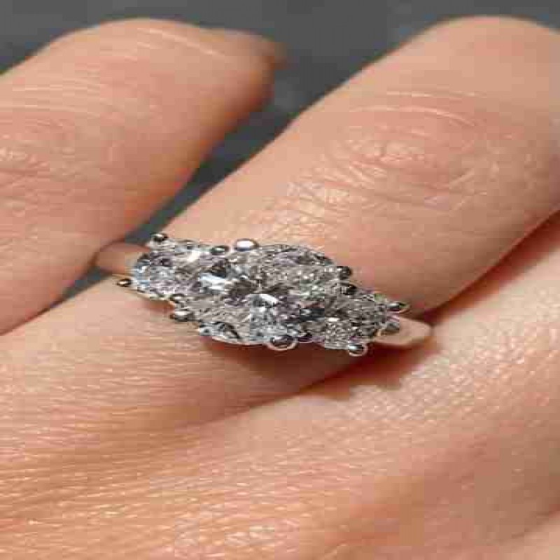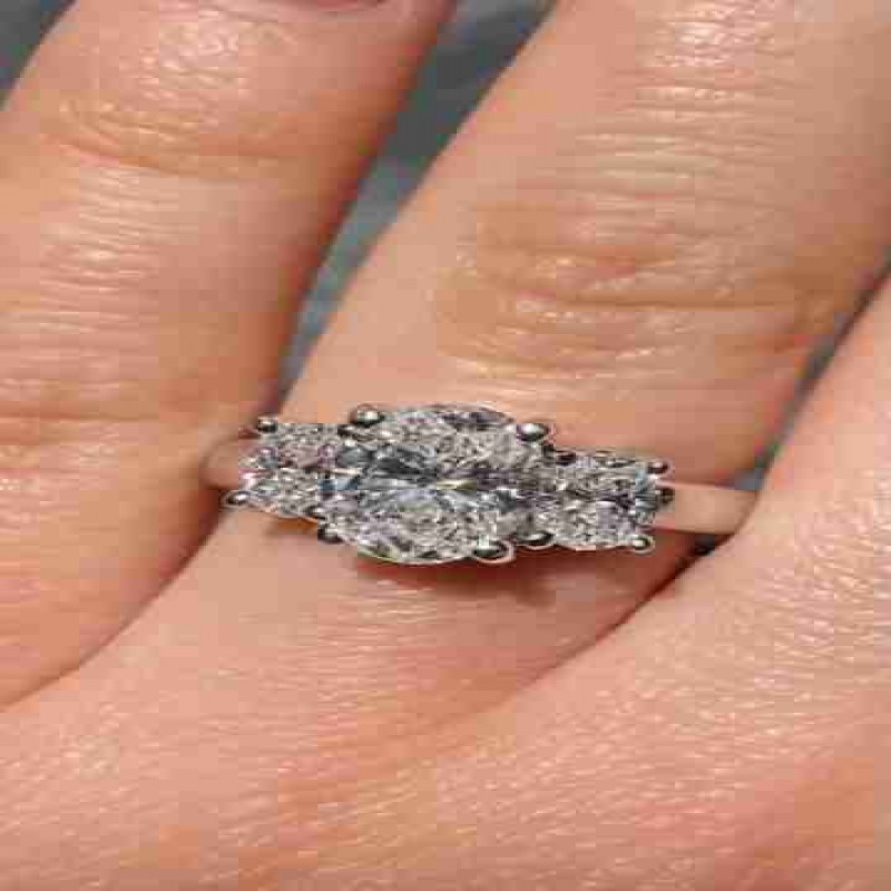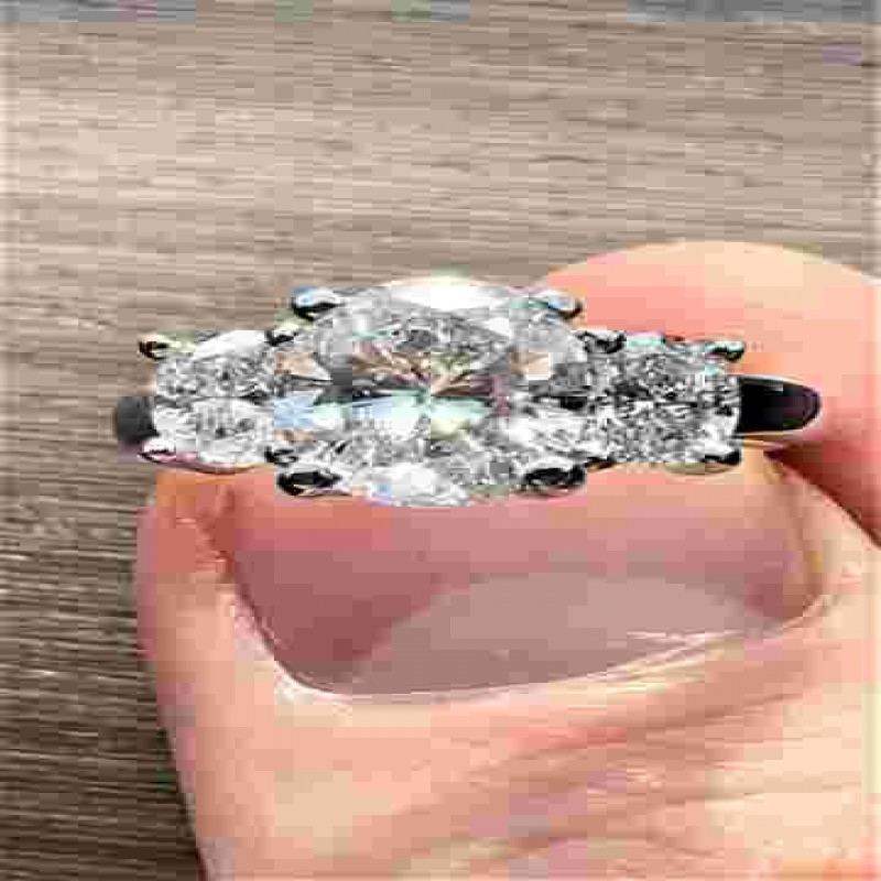 Bu üç taşlı pırlanta nişan yüzüğü, oval kesimli bir orta taş ve oval kesimli yan taşlardan oluşuyor.