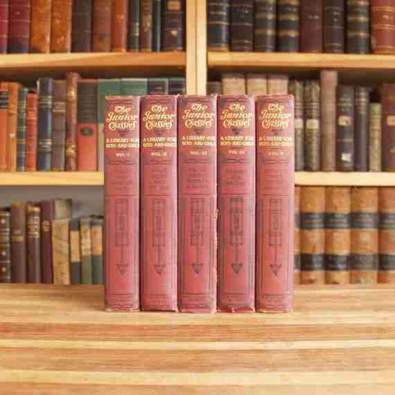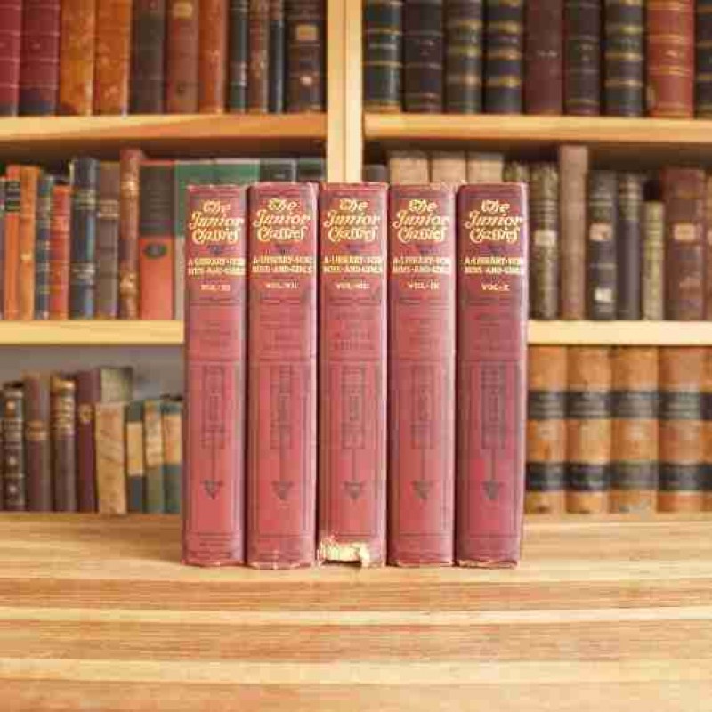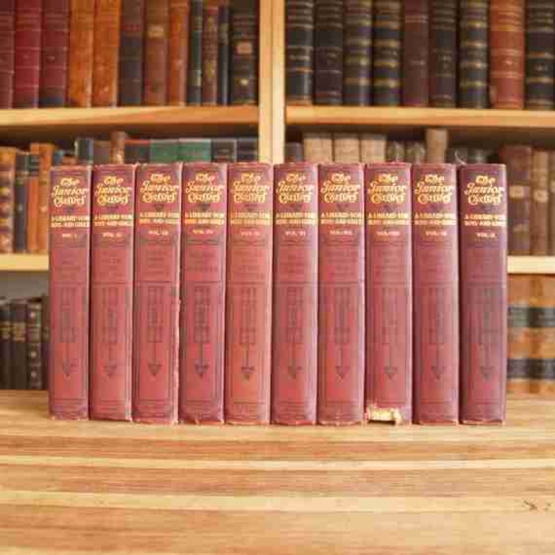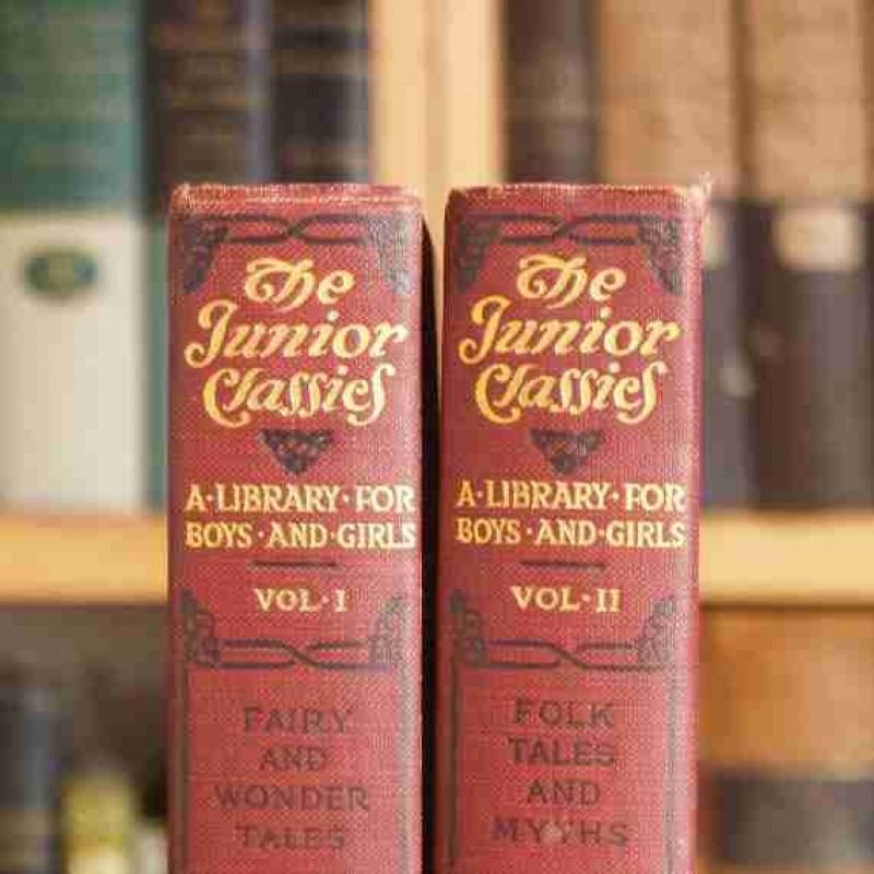 Çocuklar için on ciltlik bir edebiyat antolojisi olan Junior Classics'in harika tam seti. Cilt içerir. 1: Peri ve Harika Masallar; Cilt 2: Halk Masalları ve Mitler; Cilt 3: Yunanistan ve Roma'dan Masallar; Cilt 4: Şövalyeliğin Kahramanları ve Kadın Kahramanları; Cilt 5: Asla Eskimeyen Hikayeler; Cilt 6: Eski Moda Masallar; Cilt 7: Cesaret ve Kahramanlık Hikayeleri; Cilt 8: Hayvan ve Doğa Hikayeleri; Cilt 9: Bugünün Hikayeleri ve Cilt. 10: Eski ve Yeni Şiirler. Siyah ve yaldızlı süslemeli kırmızı kumaş ciltler. Yaldızlı üst kenar. Her ciltte doku koruyuculu renkli bir ön parça ve içinde birkaç siyah beyaz resim bulunur. Kitapların çoğu temiz ve iyi durumda; Cilt Şekil 3, ön kapakta, biraz da sırtta ağır kenar aşınmasını göstermektedir; Cilt Şekil 8 alt omurgadaki bir miktar kaybı göstermektedir. Sayfalar kahverengileşmiş, bazılarının kenarlarında lekeler var. Her kitap 5,5 x 8 inç boyutundadır.